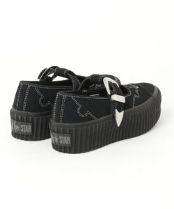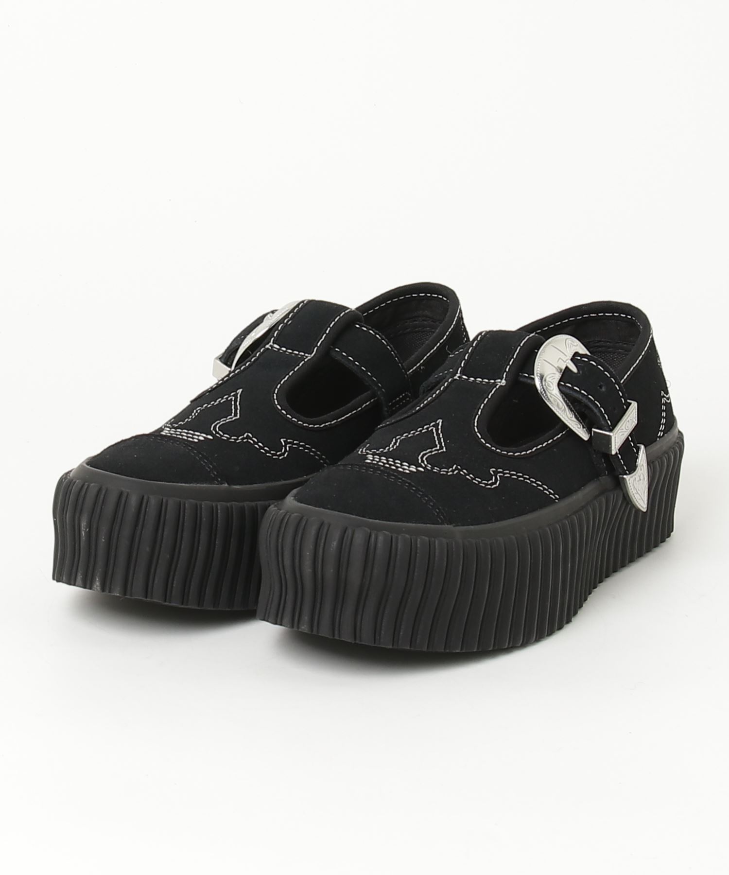 人気のTストラップパターンをベースに、ウエスタンモチーフのステッチワークや、模様が刻み込まれた金具を採用。